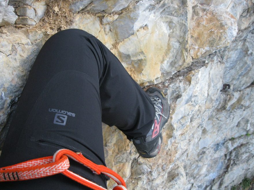Kapsa na pravém stehni kalhot Salomon WAYFARER PANT W není našitá a jako jediná není ze síťoviny.