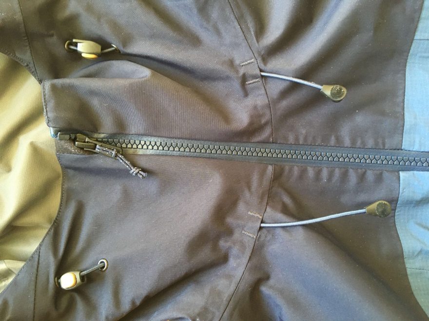 Detail samosvorného stahování kapuce s poutkem na zavěšení