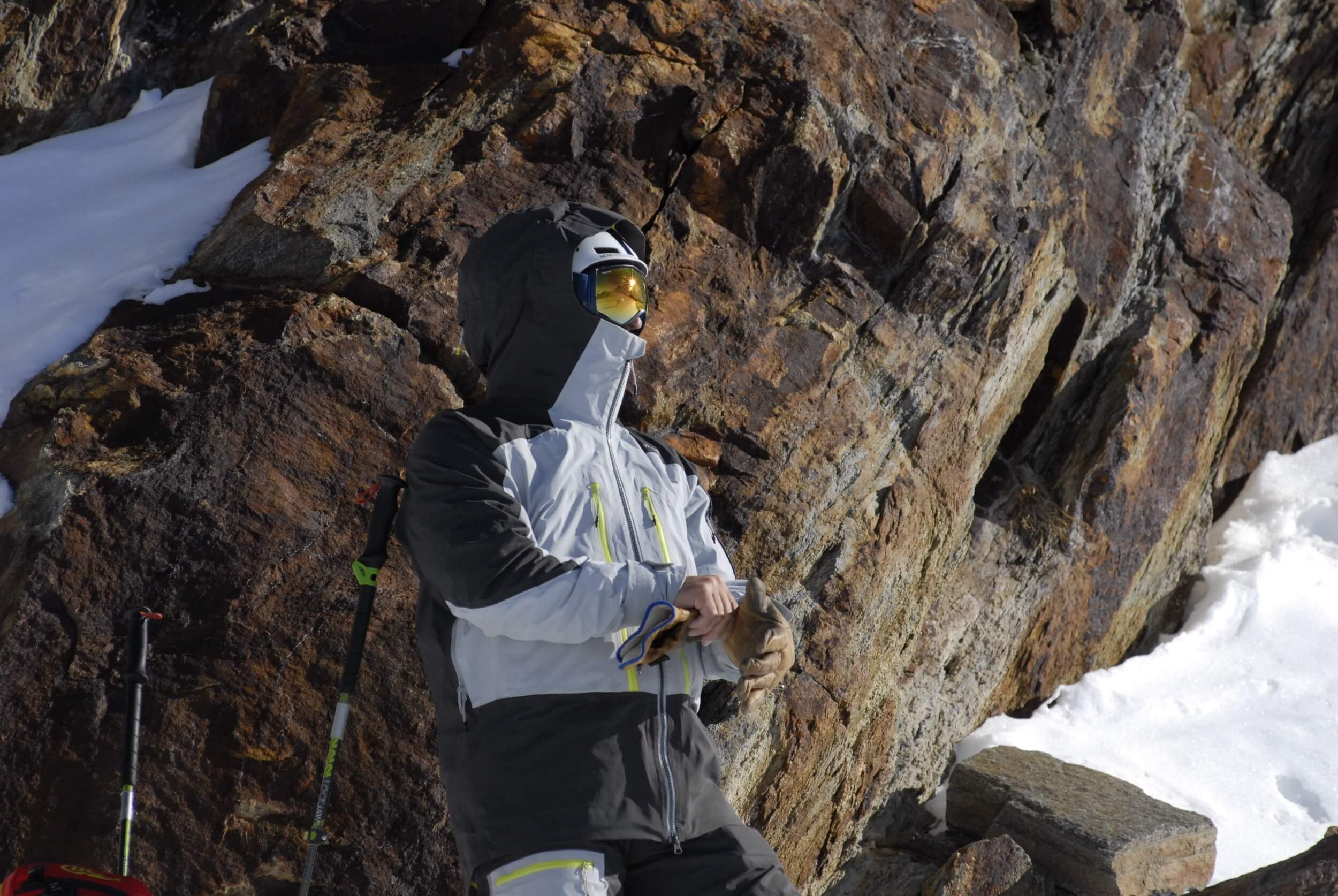 Detail vysokého límce a kapuce přes lyžařskou helmu - DECATHLON WEDZE