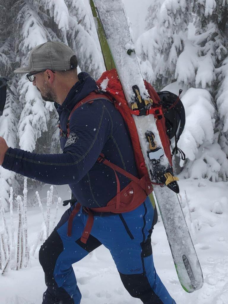 Detail fixace lyží diagonálně vyžaduje vyjmout helmu ze síťky - Deuter FREERIDE PRO 34+