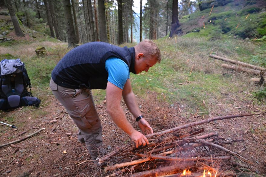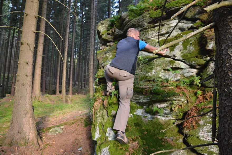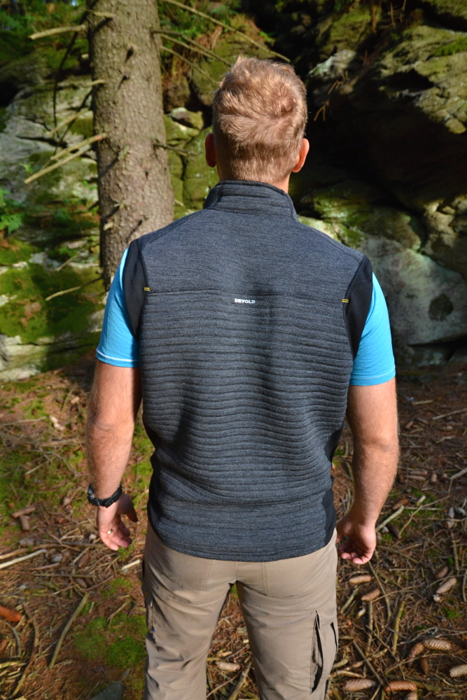 Strečové panely sahají i kolem průramků a zajišťují volnost pohybu pažemi. Vesta Devold Tinden Spacer.