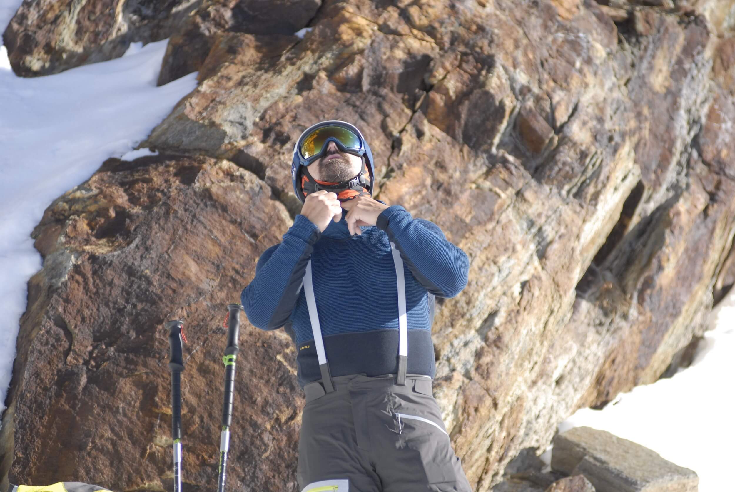 Triko Devold Tuvegga má vysoký límec, který přechází do kapuce