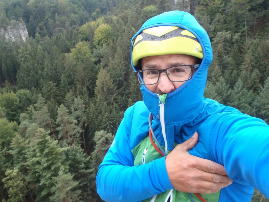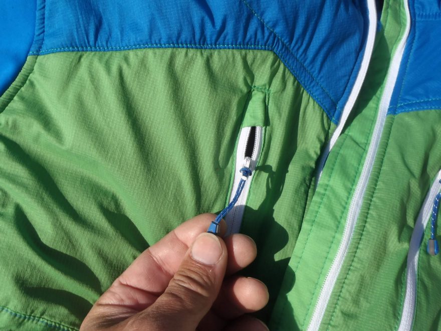 Nouzově se dá kapuce bundy Direct Alpine Alpha Active přetáhnout i přes lezeckou helmu.
