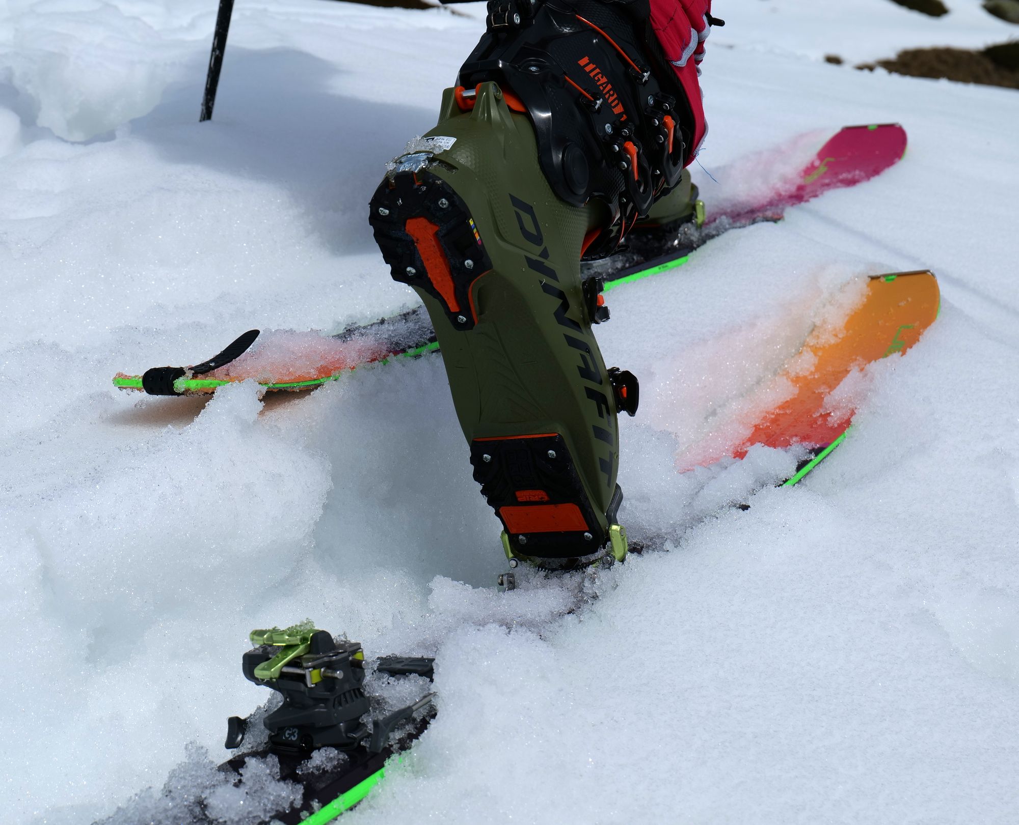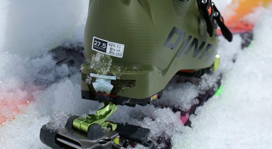 Detail podrážky Dynafit Tigard 130 rozdělenou do dvou částí a připevněnou devíti šrouby pro snadnou fixaci i záměnu