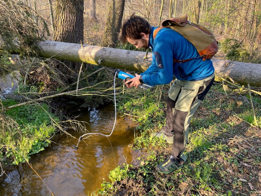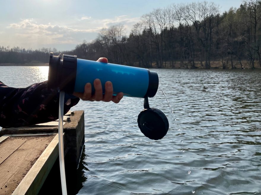 Testování rybniční vody přefiltrované lahví LifeSaver Liberty.