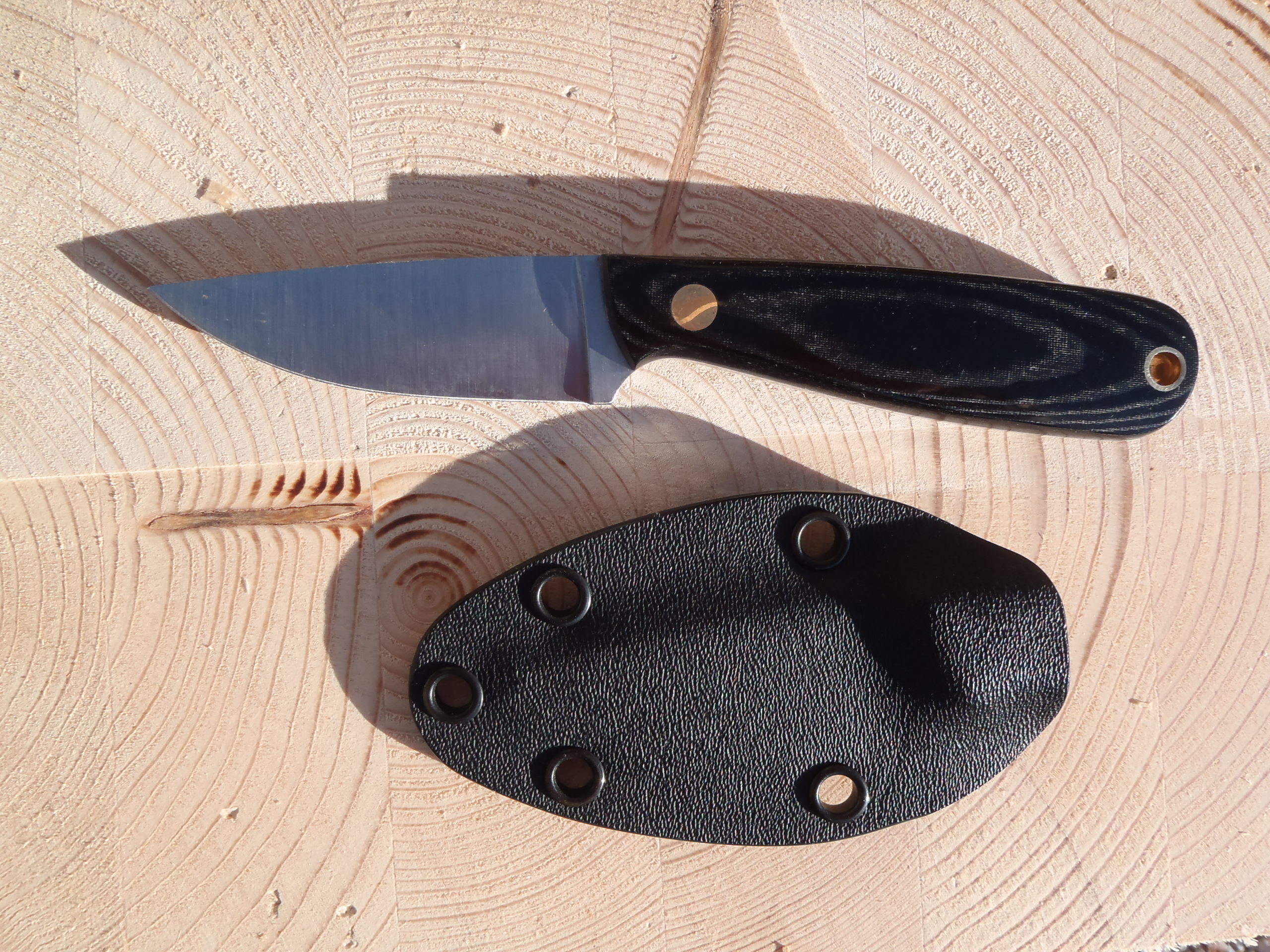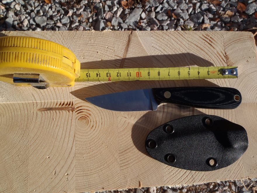 Nůž Enzo Necker 70 a pouzdro s pěti otvory pro fixaci pomocí kulaté gumy nebo paracordu.