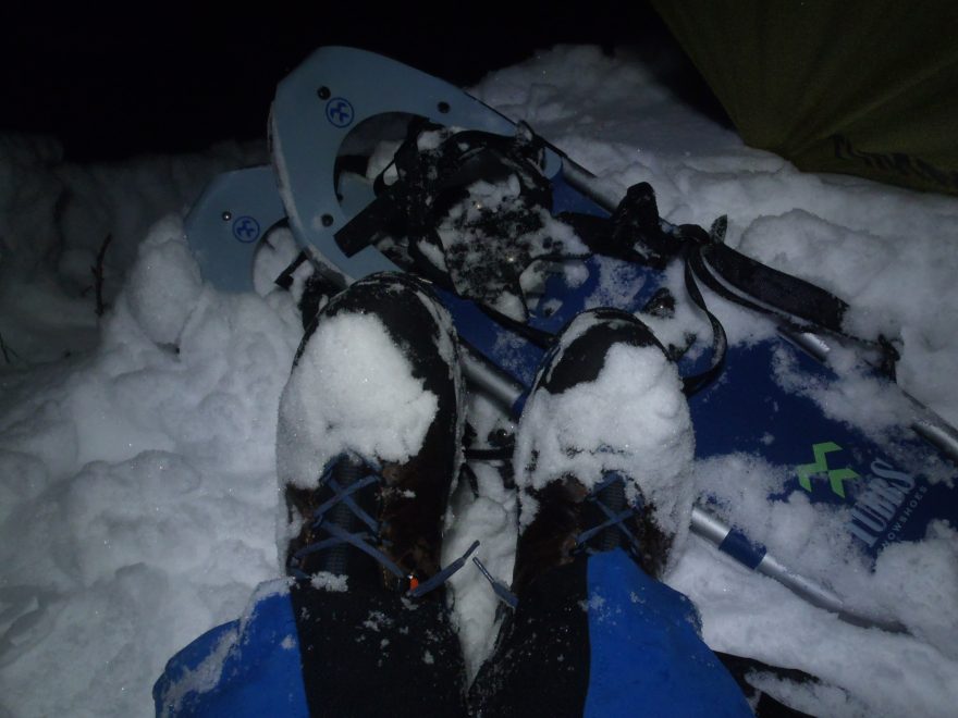 Garmont Toubkal GTX na sněžnicích a při bivakování v Krkonoších.