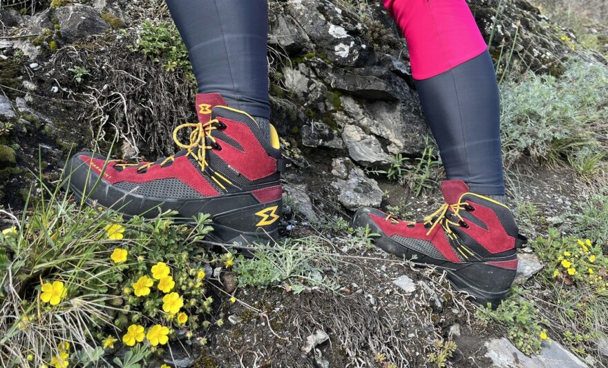 Šněrování kolem komínu boty Garmont Tower Trek GTX perfektně drží nohu a prodloužený jazyk brání padání nečistot do boty