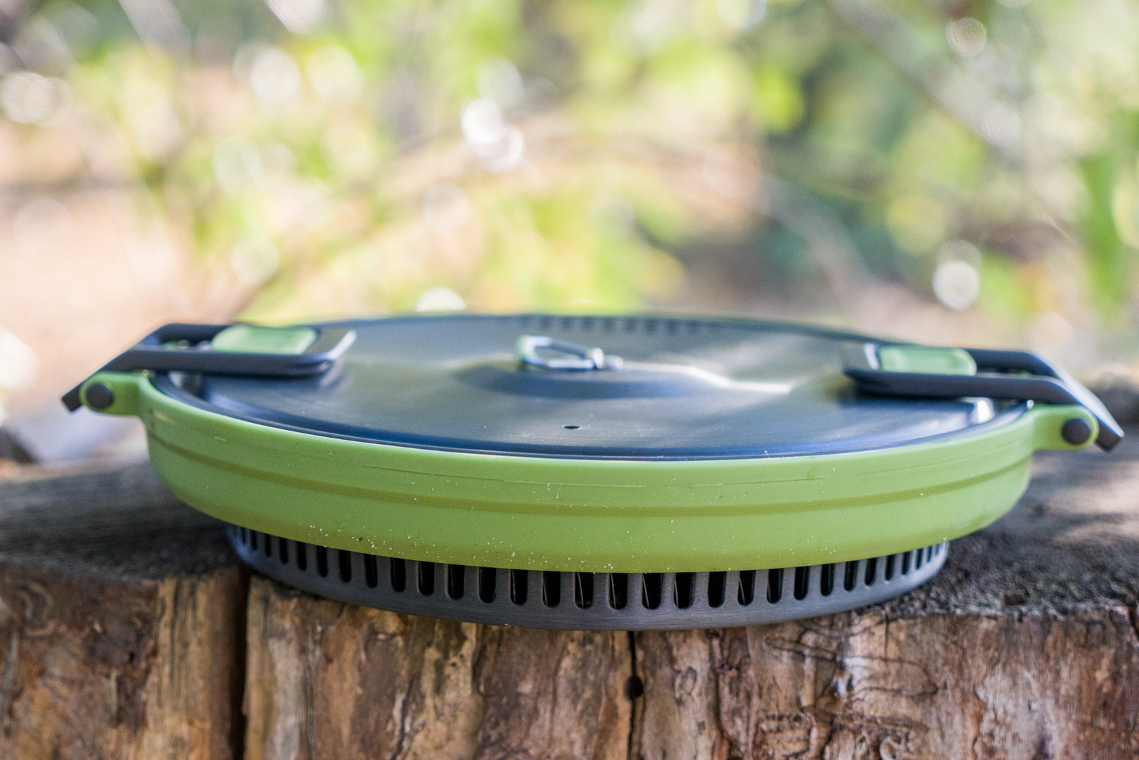 Ve složeném stavu má hrnec na výšku jen 5 cm a to opravdu není na 3litrový hrnec moc. Poklička se dá zajistit za úchyty a celek působí kompaktním dojmem