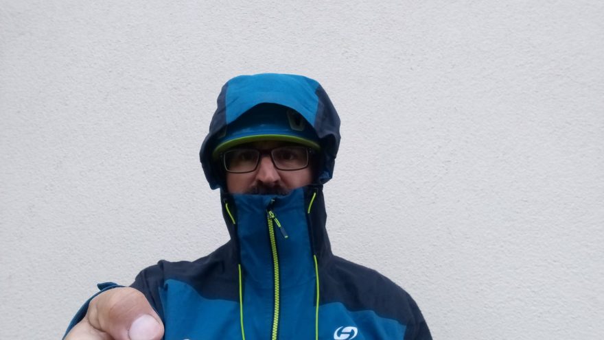 Zatažení kapuce u bundy Hannah Triag pomocí dvou pružných tkanic a tří samosvorek.