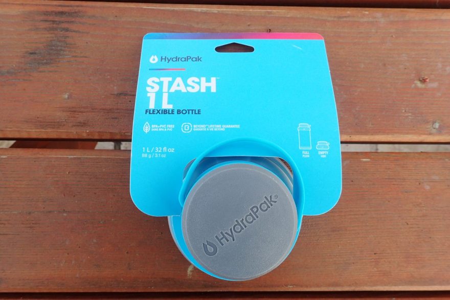 Prodejní balení HydraPak Stash 1l včetně vysvětlivek a popisu.