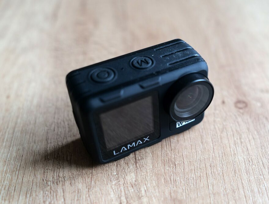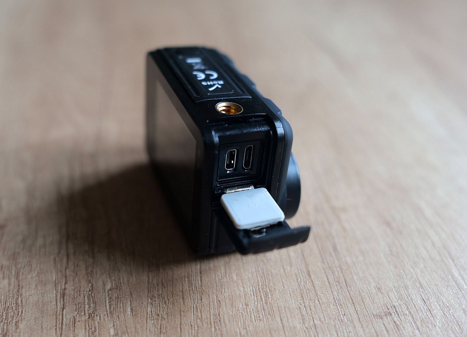 Detail bočního krytu se vstupem ke dvěma konektorům u kamery LAMAX W 10.1, kamera je vzhůru nohama