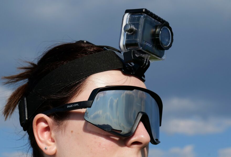 Detail předního displeje a objektivu kamery LAMAX W 10.1, nahoře jsou dvě ovládací tlačítka a na levém boku třetí tlačítko