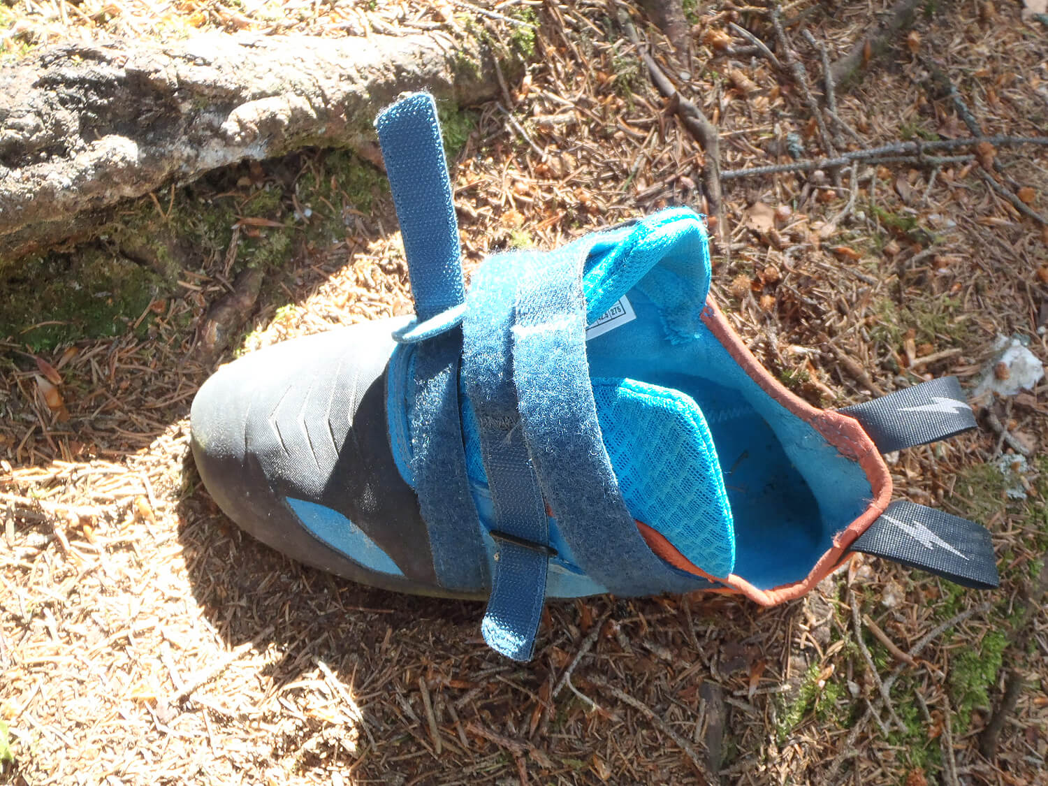 Detail stahování a trojice suchých zipů u lezeček EVOLV Shaman
