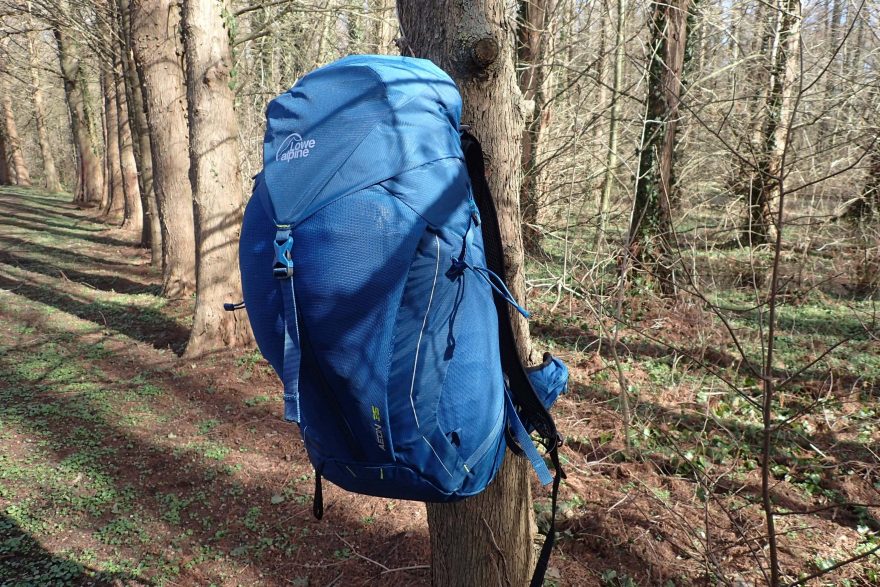 Klasická fixace cepínu do poutka a speciální kroužek na hrot teleskopické hole u batohu Lowe Alpine Aeon 35.