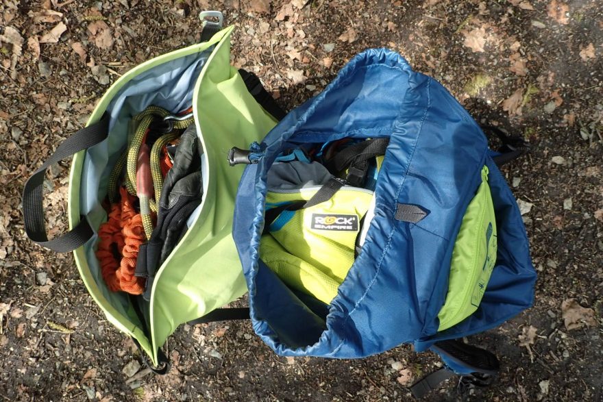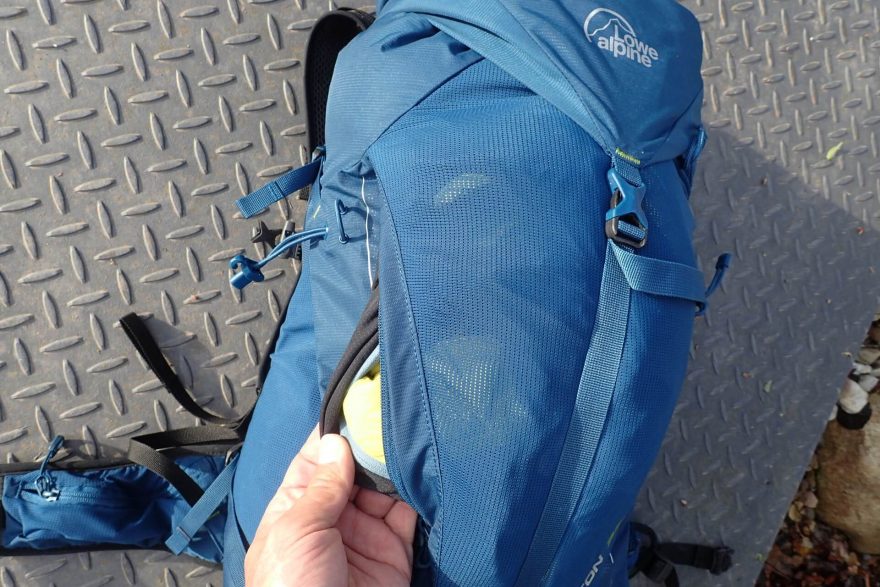 Rychlá fixace topůrka či hole pomocí samosvorky s háčkem u batohu Lowe Alpine Aeon 35.