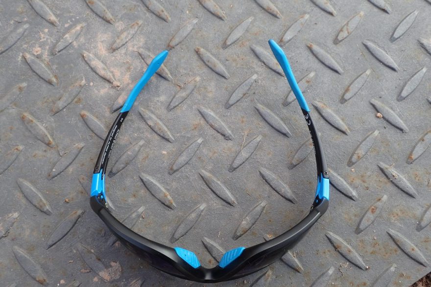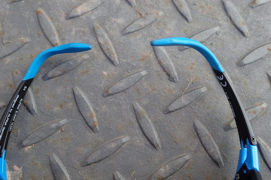Logo ALPINA nad nosníkem v barvě nožiček brýlí Alpina S-Way.
