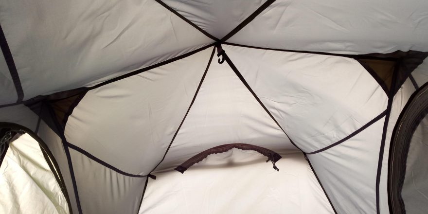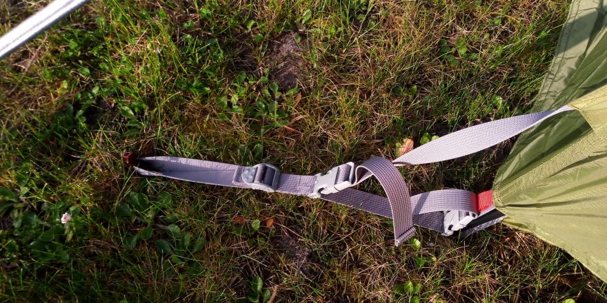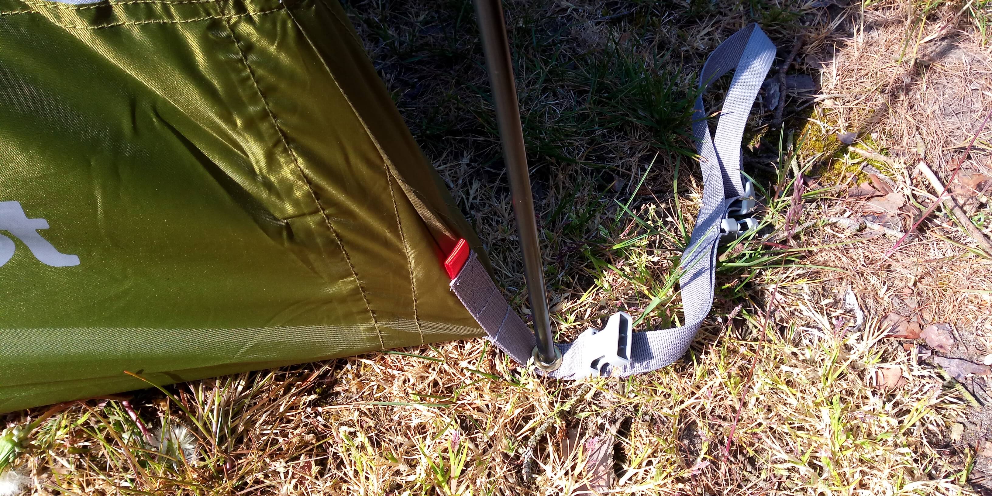 Fixace prutů se děje pomocí zúžení na prutu a kovové průchodky v popruhu – Marmot Vapor 2P.