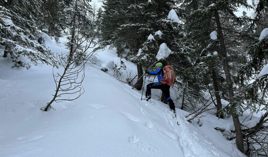 Výstup strmým svahem je díky pružnosti materiálu Montura kalhot snadný
