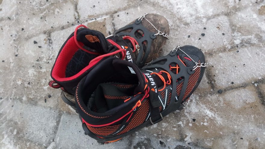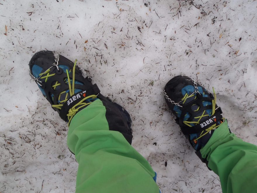 Stahovací popruhy jsem si přehodil tak, aby po stažení konec popruhu směřoval ven - YATE Ice Spikes