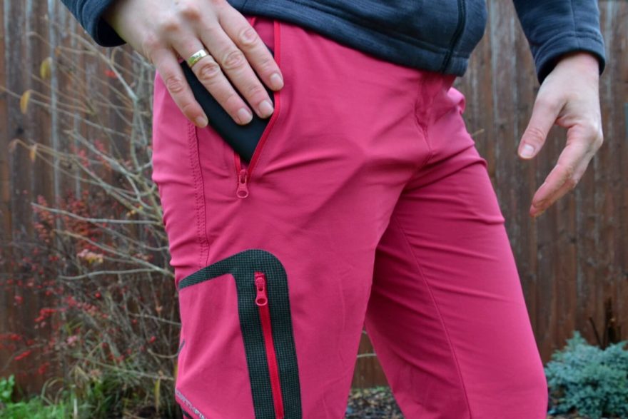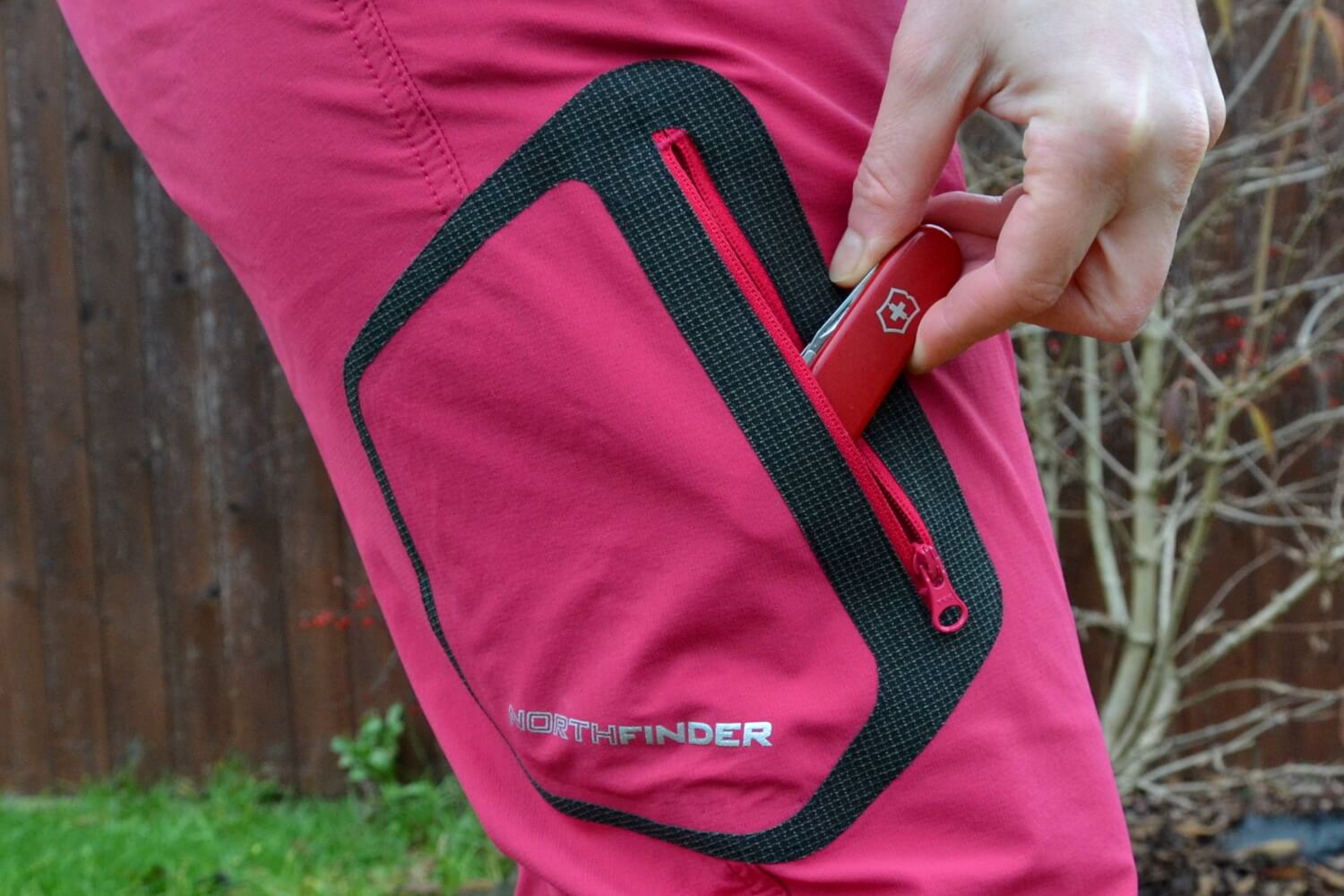 Kapsa na pravém stehně je ideální na kapesní nožík či klíče. Dámské outdoorové kalhoty Northfinder Mattie.