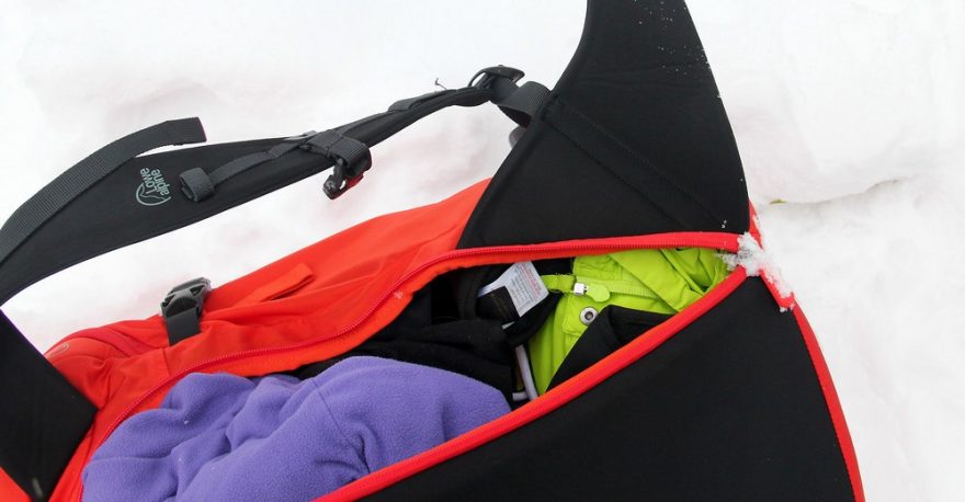 Detail horní přesky s pojistkou u Lowe Alpine Descent 35, kousek nad ní je patrné vyztužení proti poškození hranami