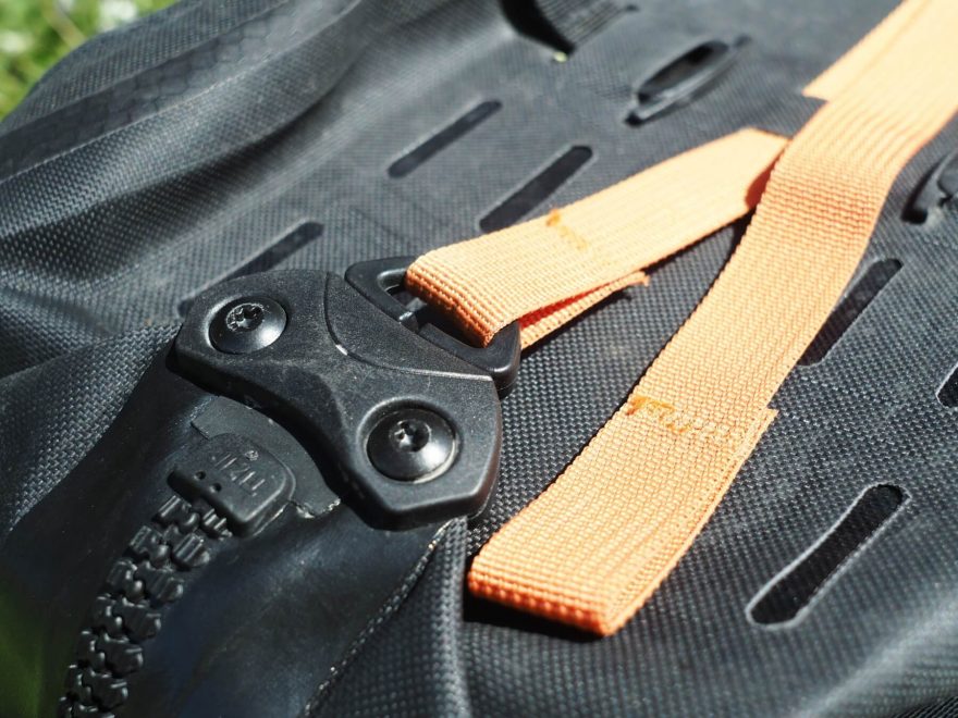 Aby dlouhé popruhy po stažení batohu jen tak nevlály, je na kompresním popruhu i plastový háček, který se postará o zkrocení vlajících popruhů. Ortlieb Atrack BP 25.
