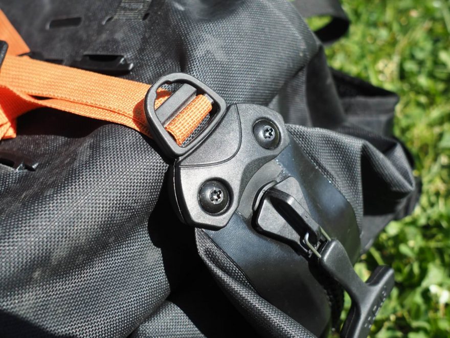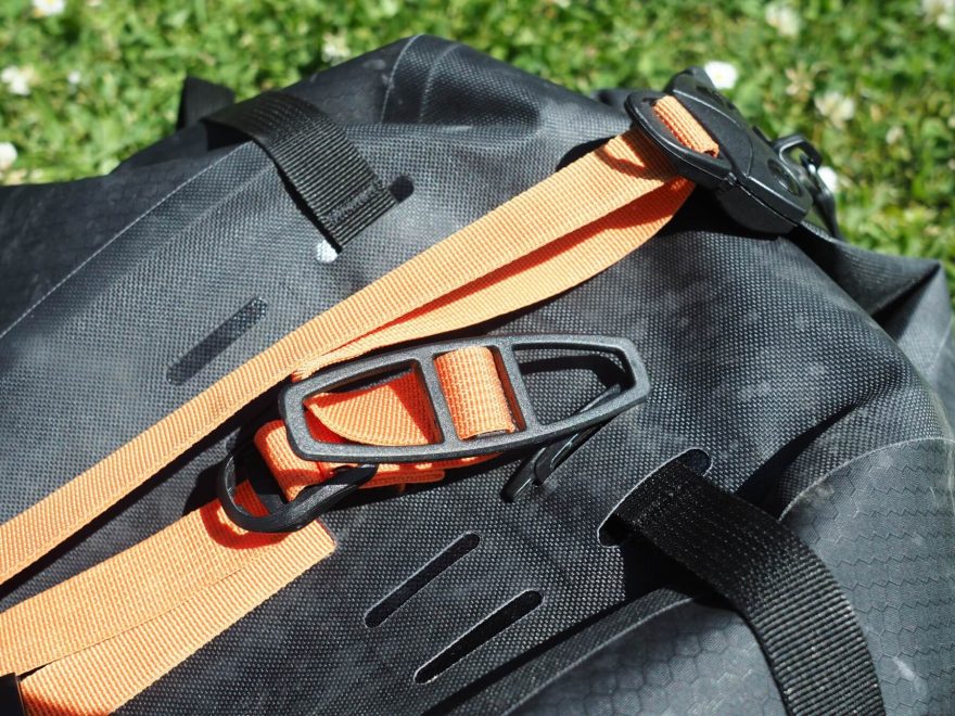 Na batoh Ortlieb Atrack BP 25 lze jednoduše a rychle připevnit přilbu. Slouží k tomu plastový díl na středovém stahovacím popruhu.