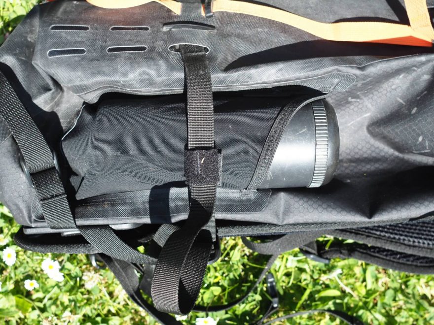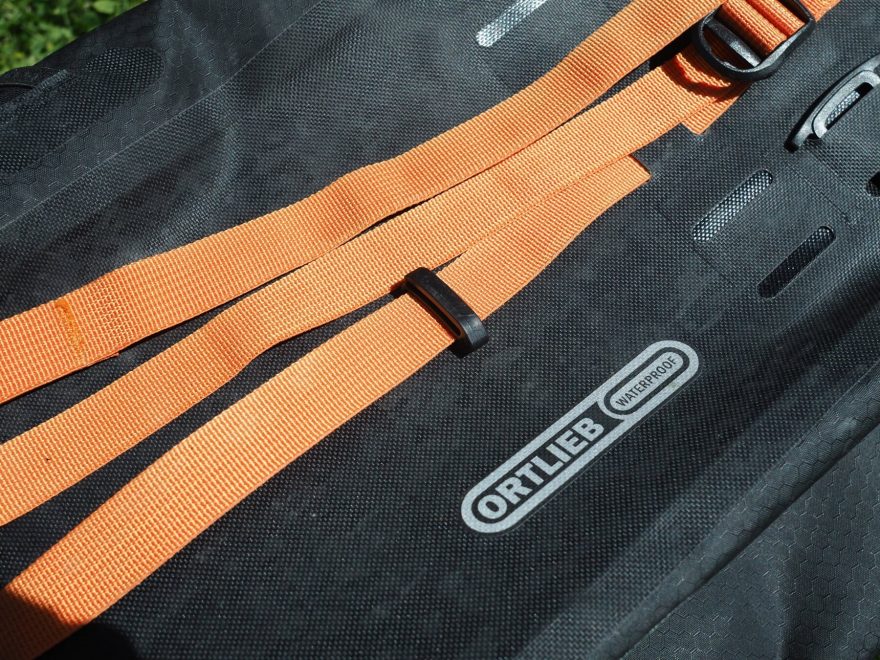 Na čele batohu Ortlieb Atrack BP 25 si okamžitě všimneme oranžového stahovacího popruhu a reflexního loga Ortlieb.