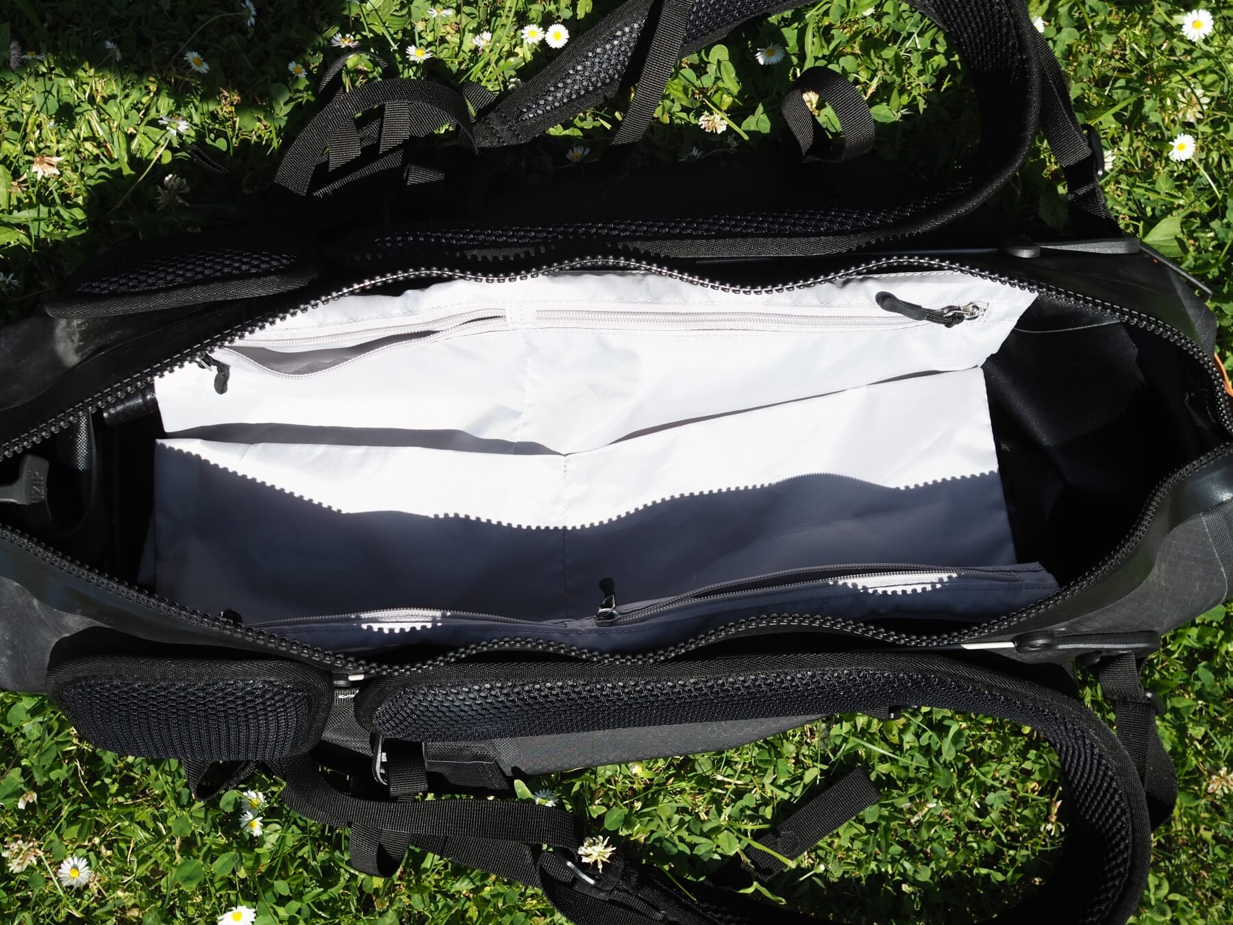 Pohled dovnitř batohu Atrack BP 25, kde najdete čtyři zipové kapsy.