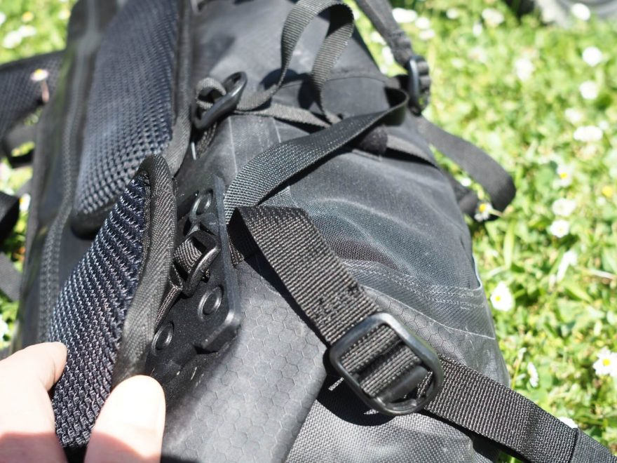 Tenký bederní popruh je ramenním popruhem spojen plastovou sponou. Ortlieb Atrack BP 25.