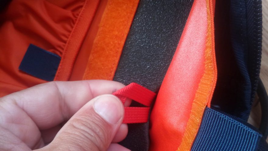 Popruh se sponkou na zavěšení vodního vaku v batohu OSPREY Mutant 22.