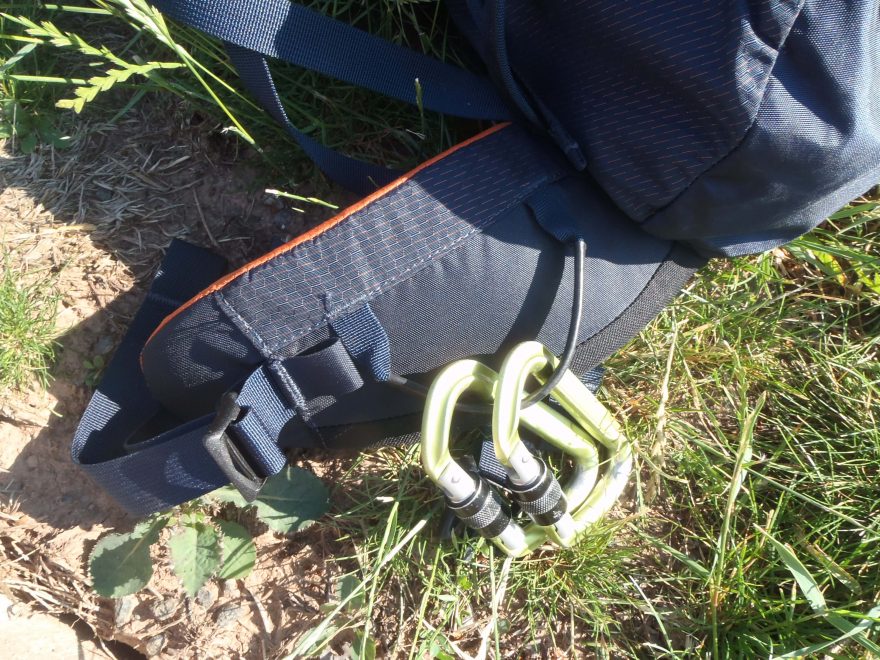 Kompletně nabalený batoh Osprey Mutant 38 včetně nasazeného víka a síťky na helmu.