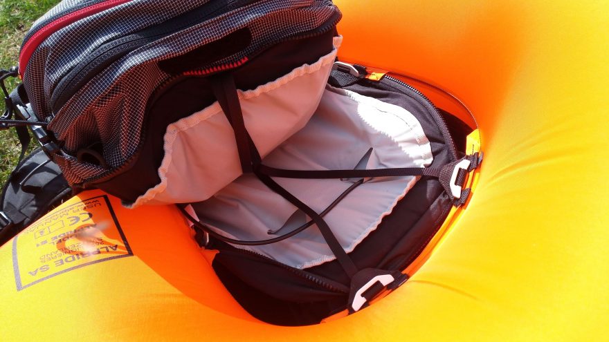 Detail na pravý bok batohu Osprey Soelden PRO 32 - zesílené popruh ypro lyže, síťka kompresoru, boční kapsa