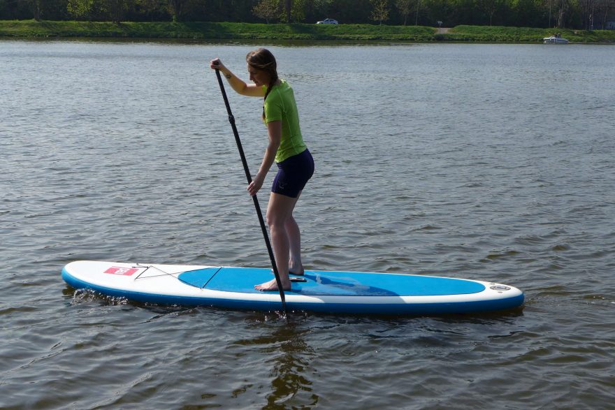 Dámské funkční triko s krátkým rukávem a šortky z bambusové viskózy při testování na paddle boardu.