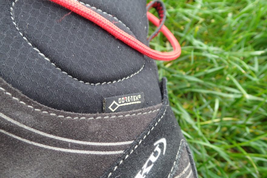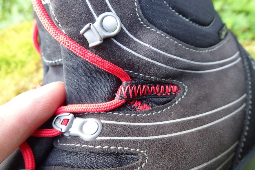 Místo klasického háčku má pohorka AKU Alterra GTX toto textilní poutko, které rozděluje utažení mezi nárt a kotník.
