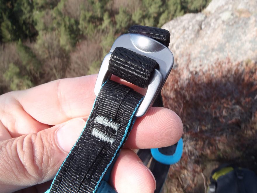 Detail hliníkové spony QB, kterou popruhy chodí hladce – Rock Empire 3B Akatta.