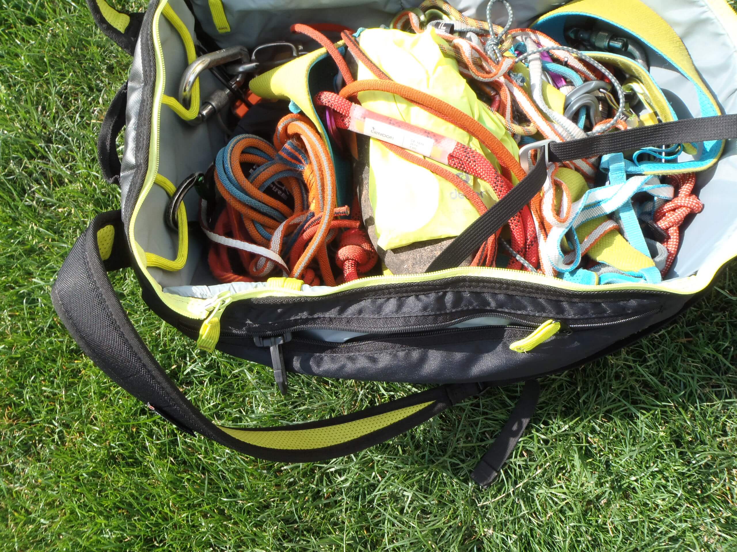 Vnitřní plastová karabinka na klíče ve velké vnější 3D kapse lanobatohu Rock Empire Beetle Bag.