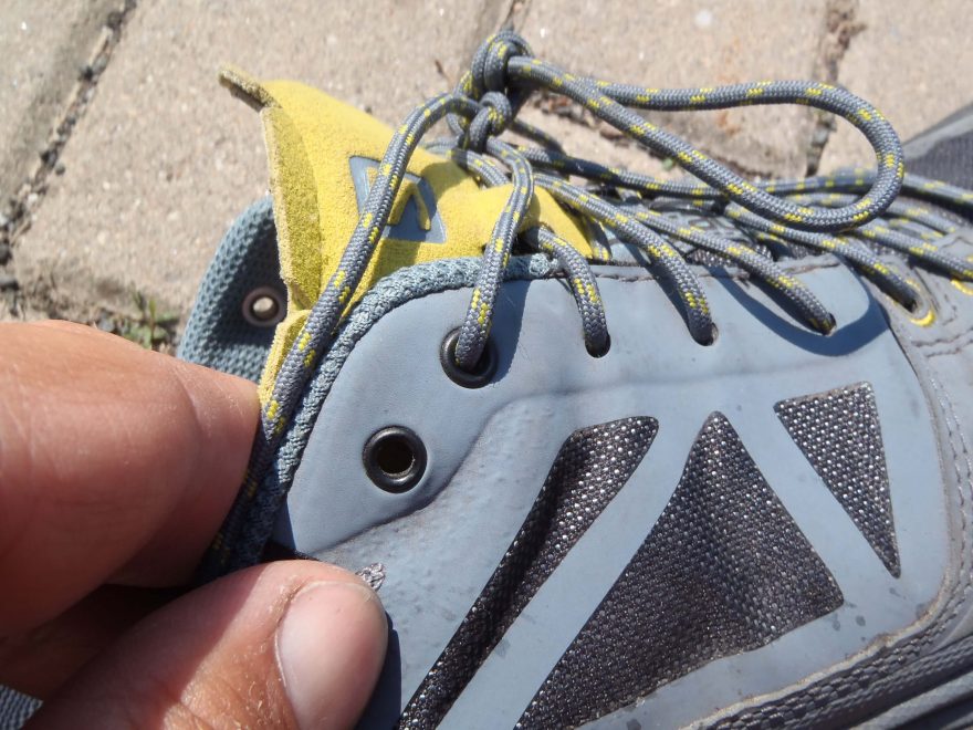 Extra očko pro těsnější zatažení bot Salomon X ALP SPRY GTX.