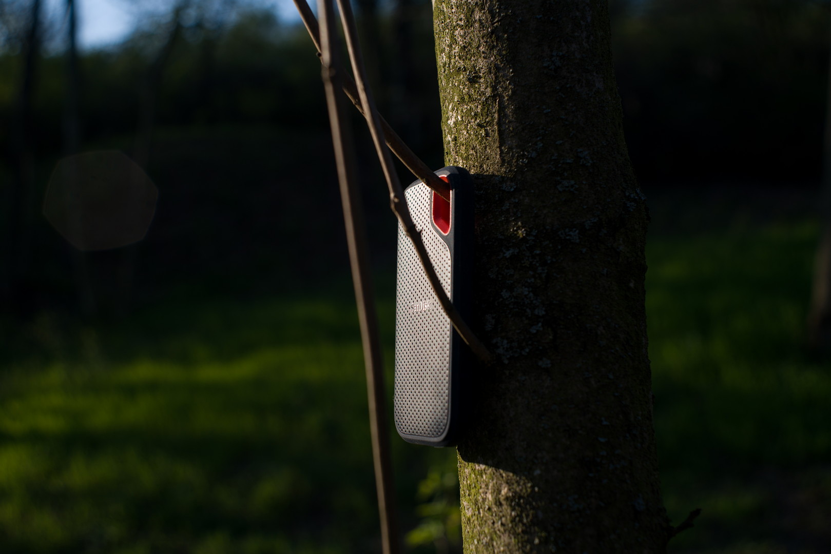 Povrch disku je kombinovací perforovaného plastu a gumy. Přední straně vévodí lesklé vystouplé logo Sandisk