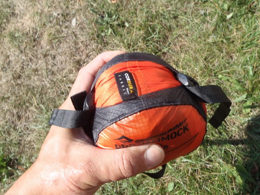 Na krev zatažené kompresní popruhy zabalené hamaky Sea to Summit Pro Hammock Single.