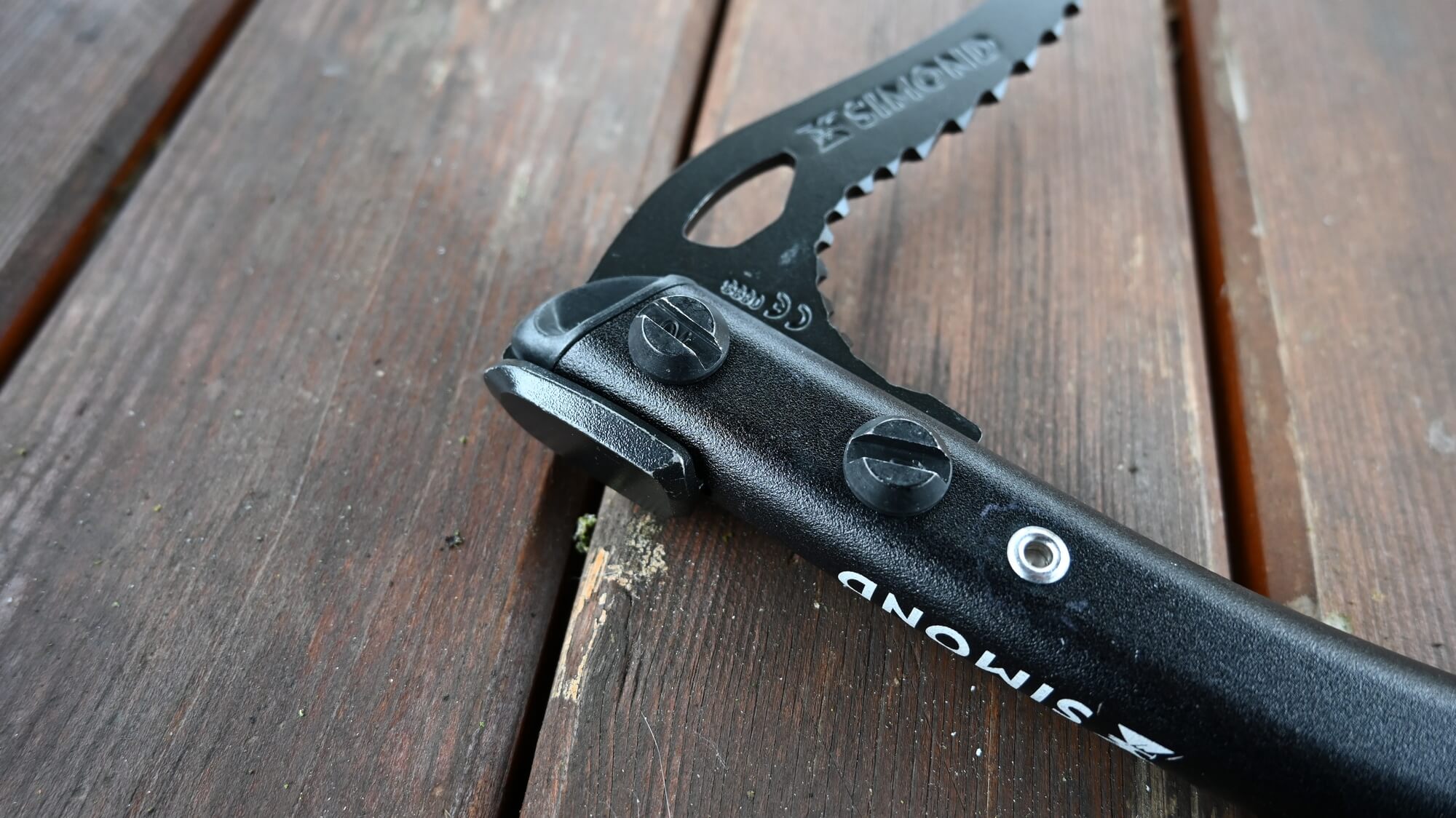 Detail hlavice cepínu SIMOND MAMBA s tloukem a dvojicí šroubů
