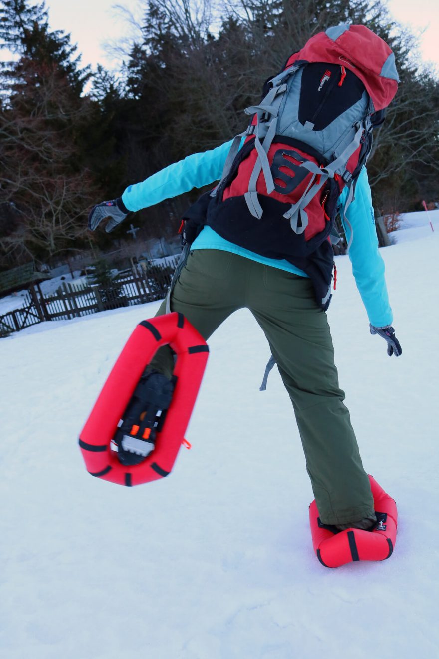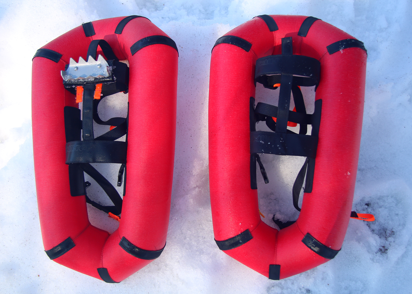 Spodní strana nafukovacích sněžnic SmallFoot s proskluzovými hroty vlevo a bez nich vpravo.