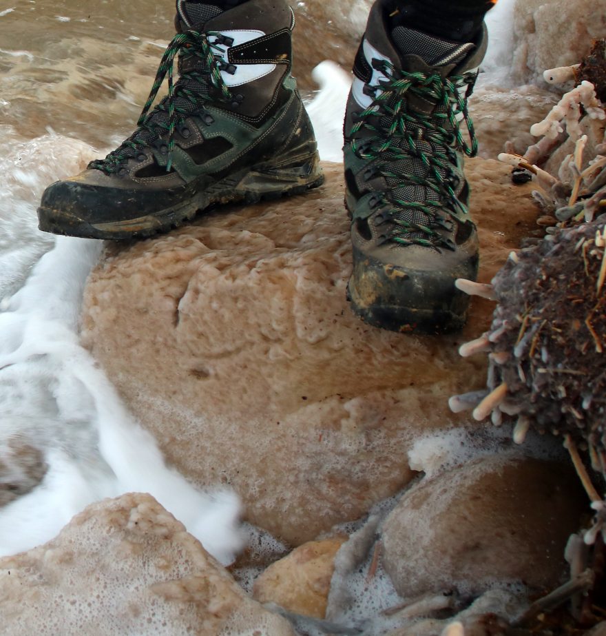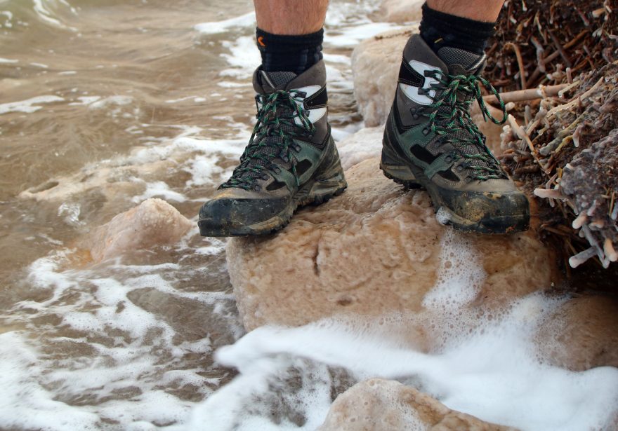 Kvalitní podrážka outdoorových bor Prabos SOCOMPA GTX neklouzala ani na solí obalených kamenech na březích Mrtvého moře.