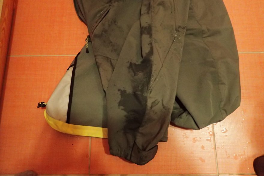 Rozdíl mezi použitými materiály u bundy HH Vanir Logr v dešti je zřetelný.