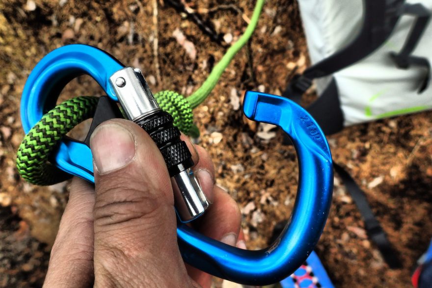 Karabina ROCK EMPIRE 2TAP připravena na batohu k zajištění dojištění na zajištěné cestě.