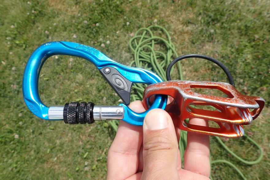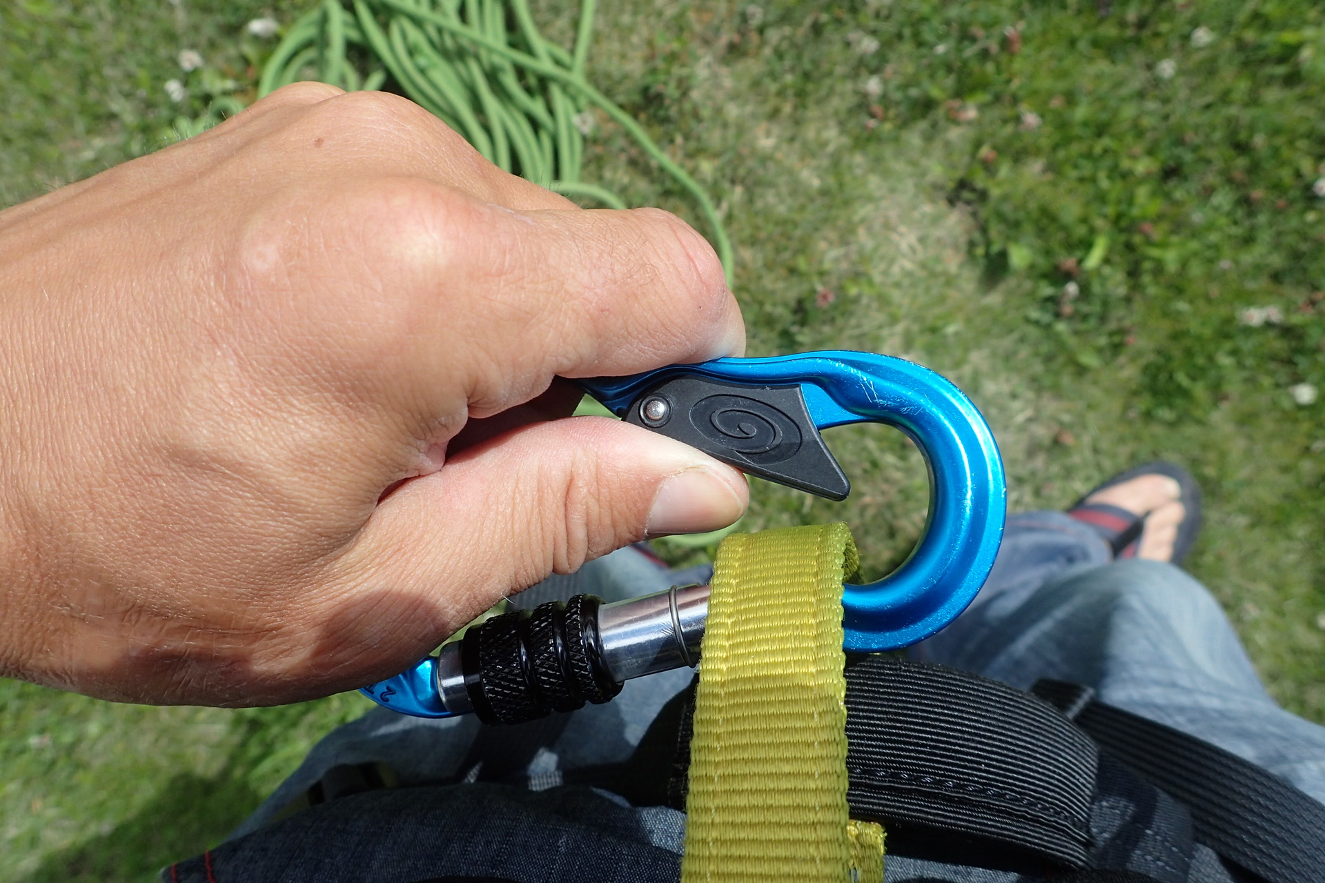 Nacvaknutí karabiny ROCK EMPIRE 2TAP do jistícího oka sedacího úvazku.