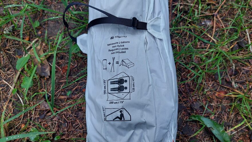 Zabalený stan FORCLAZ TARP MT 900 v porovnání s lahví piva