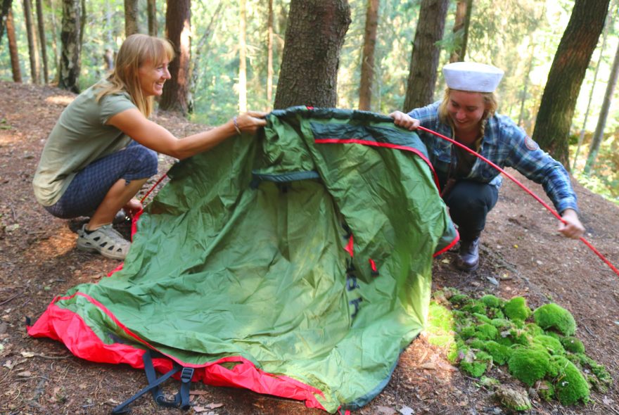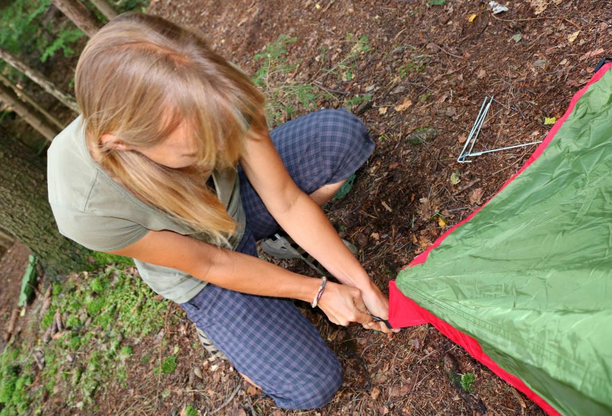 Detail centrálního prutu, větracího otvoru a vytažené podlážky u stanu High Peak Siskin.