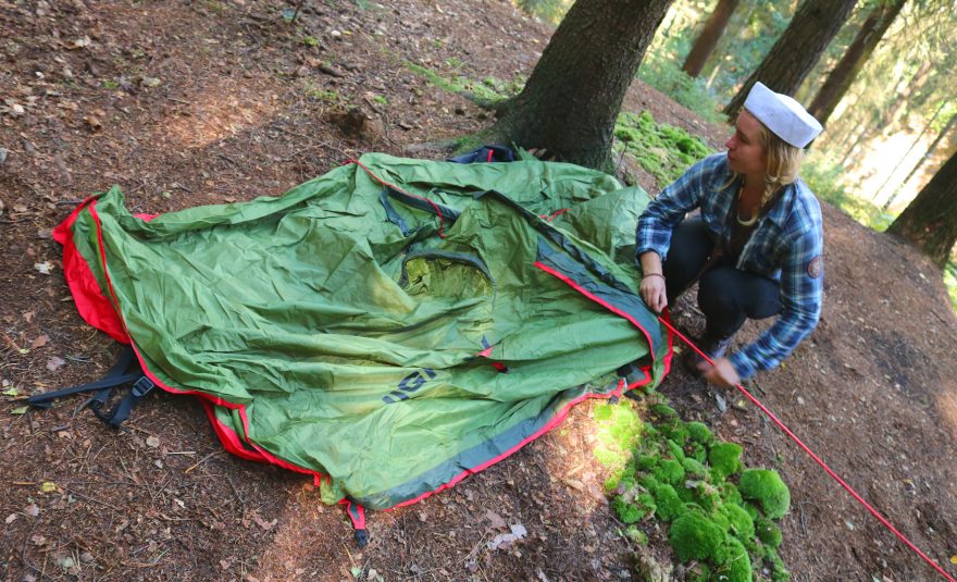 K zajištění stanu High Peak Siskin slouží jednoduché tenké kolíky z kulatiny.